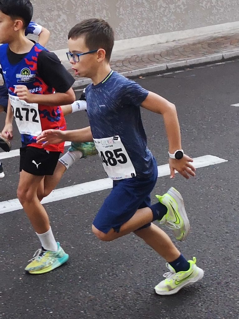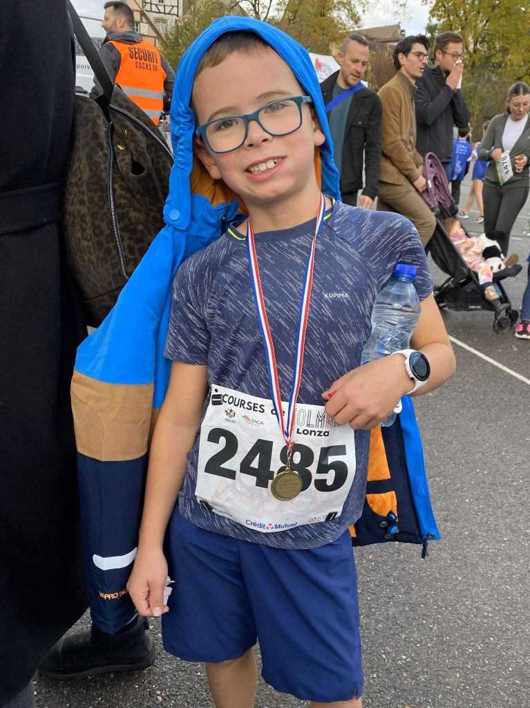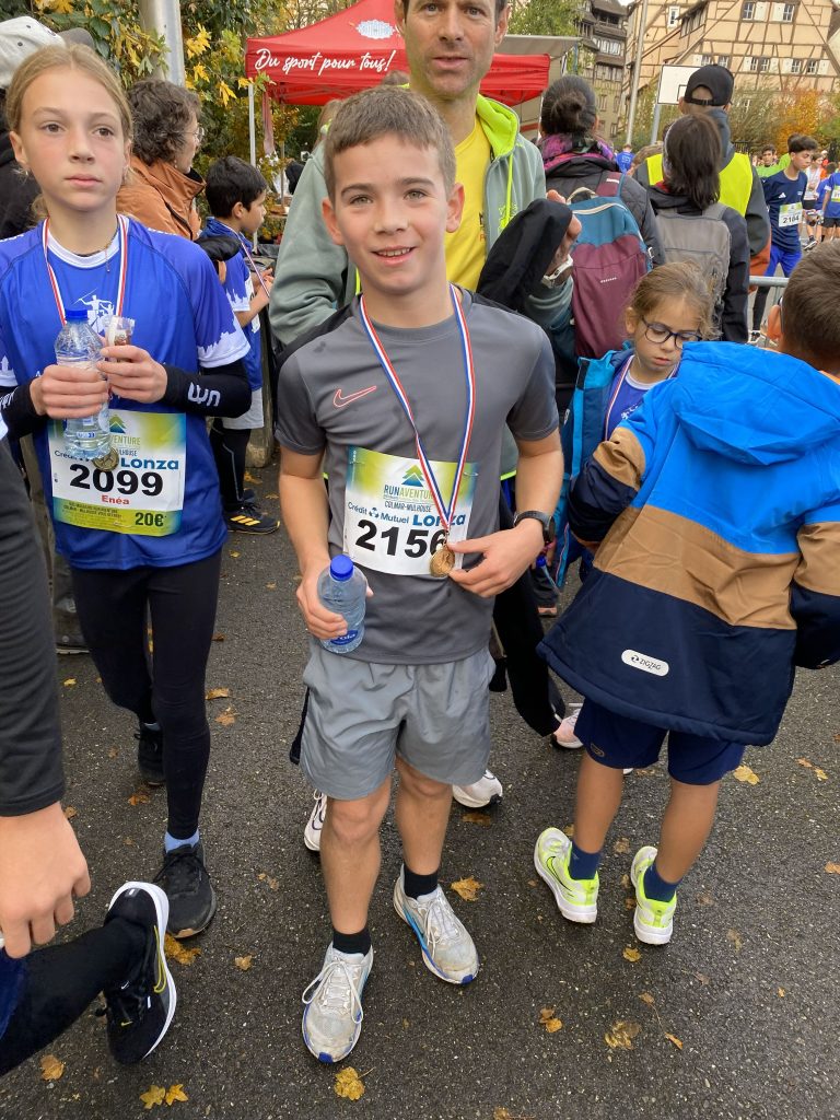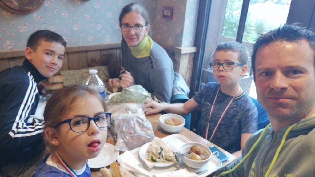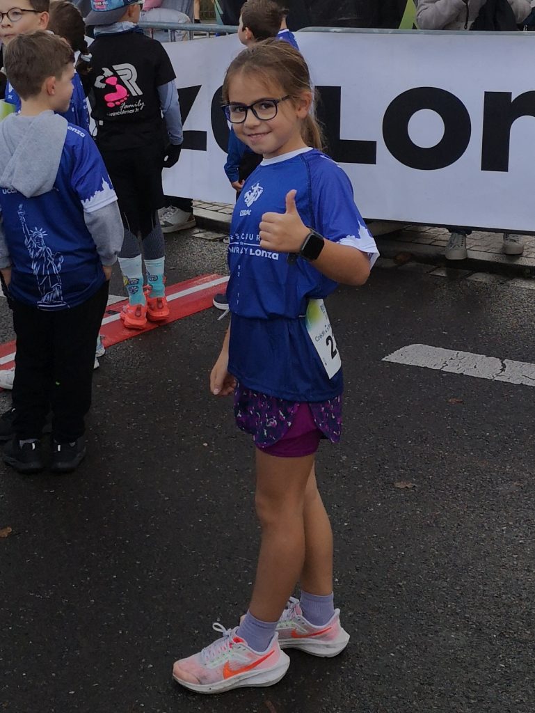 Le programme est chargé pour ce dimanche matin. Malgré les prévisions qui n’étaient pas bonnes, nous avons de la chance avec la pluie. C’est mouillé mais il ne pleut pas et la temperature est idéale. A 9h30, je fais presque toute la course avec Anthea, mais pour les garçons, je les attends peu après le départ pour hurler et prendre quelques photos comme je peux ! Florence nous attend tous à l’arrivée.